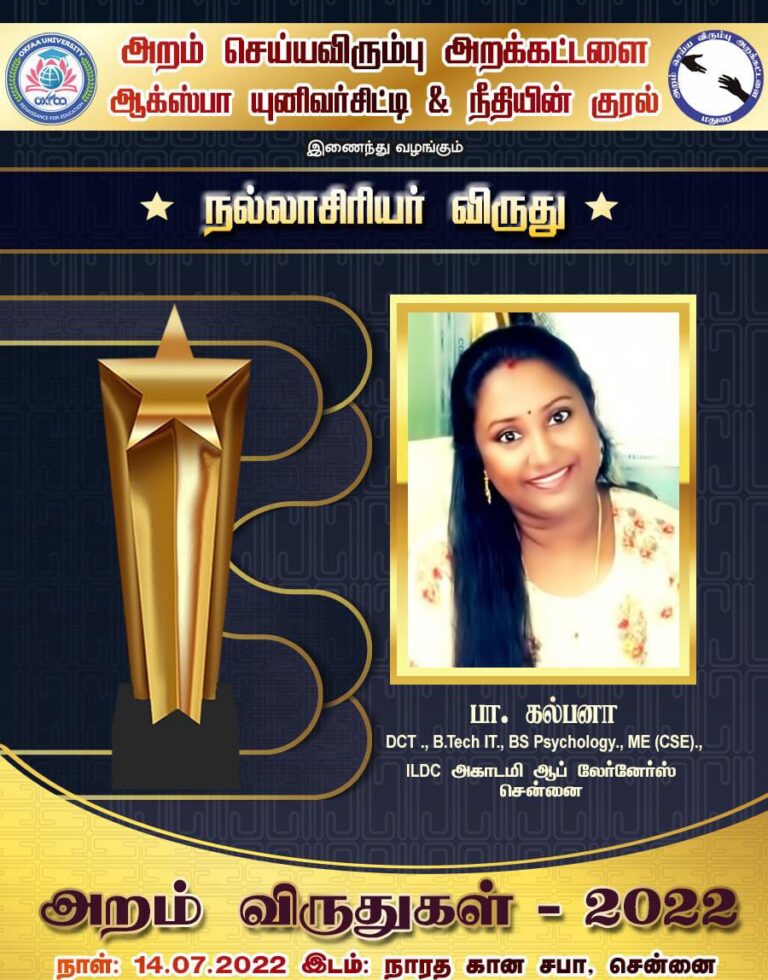 Received Best Teacher Award | Aram Awards 2022 | Presented by Aram Seiya Virumbu Arakattalai,  Oxfaa University & Neethiyin Kural
